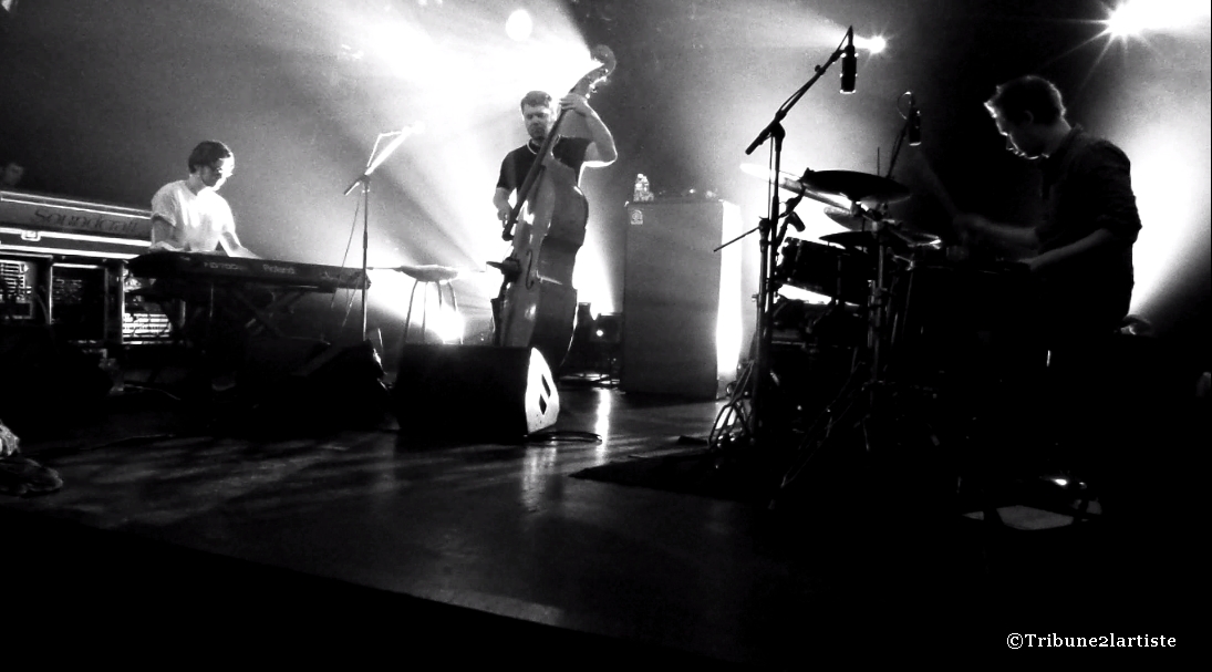 21heures 10, l’impatience des spectateurs prend fin. Apparaissent enfin 4 jeunes gens (le trio + ingénieur du son) à l’apparence normale; et dans leur attitude, rien n’indique qu’ils vont en découdre. Les 3 qui occuperont la scène, un brin timides, on se sent comme forcé d’être en empathie avec eux. Ce sentiment est encore amplifié lorsque le contrebassiste prend la parole et glisse quelques mots en français en guise d’introduction.