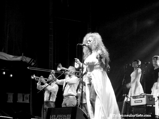 Soul, soul, soul ! Voilà un groupe qui claque comme ceux que l’on voit du côté du Sud des USA. Le groupe composé de musiciens nantais envoie du lourd avant l’entrée en scène de Tina Turner, euh… Toni Green. Chevelure blonde ondulée, tenue sexy blanche, la ressemblance est frappante ! Et côté voix, T. Green assure. Elle s’inscrit dans la lignée des Sharon Jones, Naomi Shelton et consorts. Jouant avec le public avec ses mimiques typiquement soul, elle donne une dimension à ce concert. Les musiciens de leur côté assurent le show avec des solos bien sentis.
